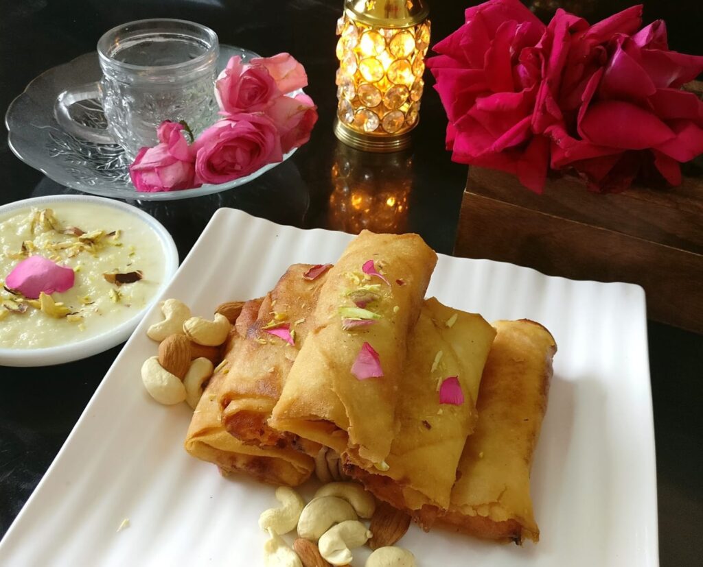 An Indo-fusion treat crispy spring rolls filled with warm gajar halwa, served with creamy rabdi.