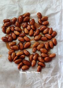 - Once coated well, take out the almonds from stove top and transfer them onto a parchment/butter/waxed paper to cool down.