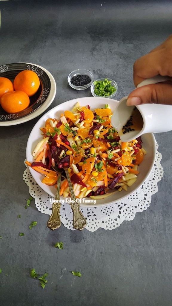 Walnuts also go well in this salad. Feel free to add dry fruits of your choice.