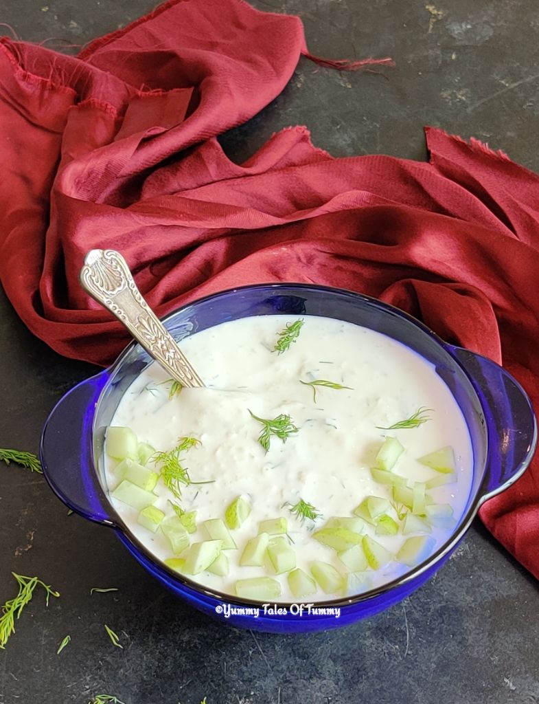 - Now combine the cucumber, yogurt, lemon juice, olive oil, garlic, salt and dill leaves.