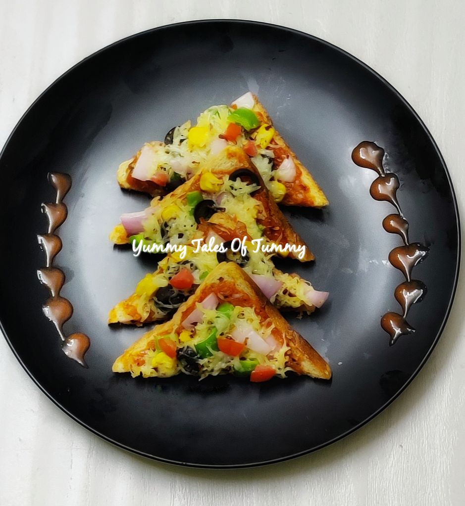 To make bread pizza all you need is few bread slices, chopped veges, grated cheese and Pizza sauce.
