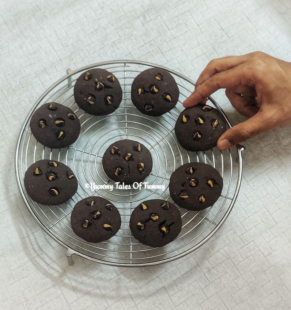 These Double chocolate chip cookies | Chocolate chip cookies are eggless, has double chocolate and made without using baking powder and baking soda.