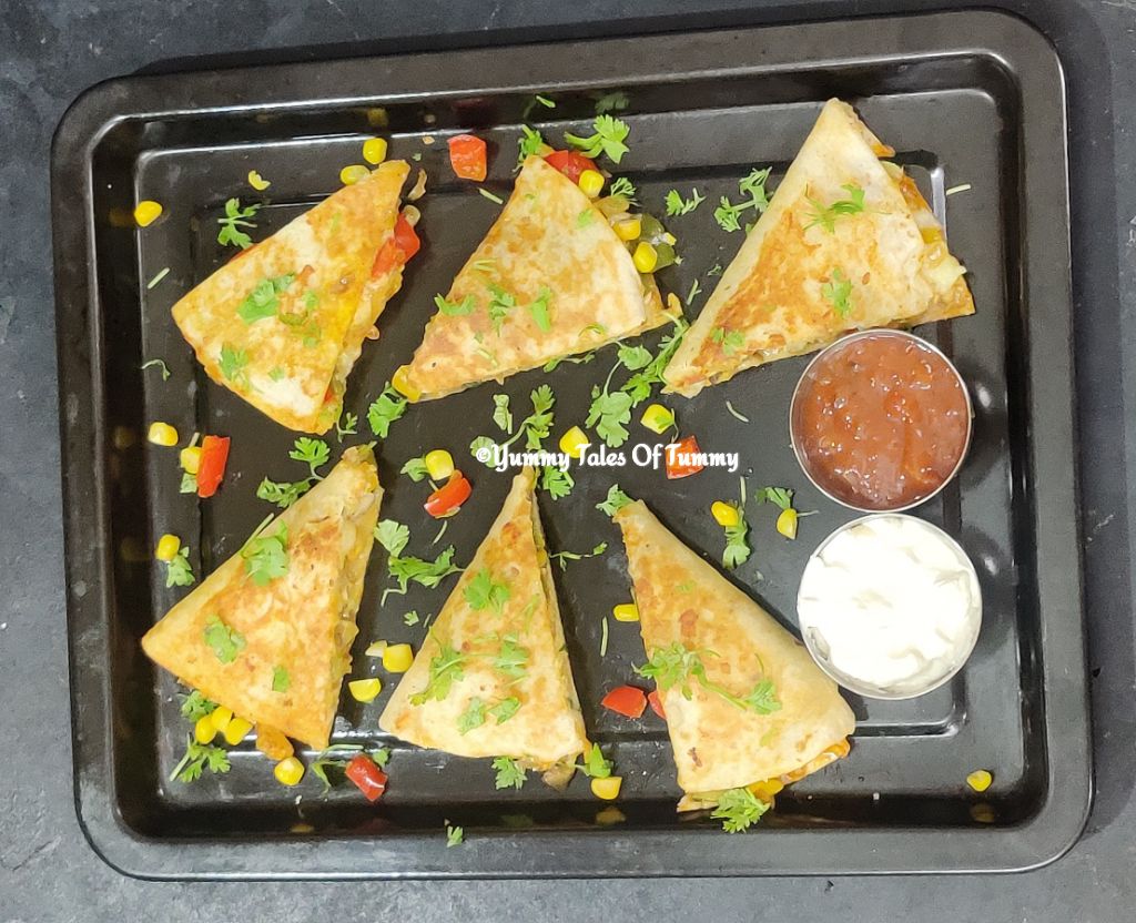 A quesadilla is a Mexican cuisine dish, a type of taco, consisting of a tortilla (chapati) that is filled with veges or meat, spices and cheese, and then cooked folded on a griddle(tava) or stove.