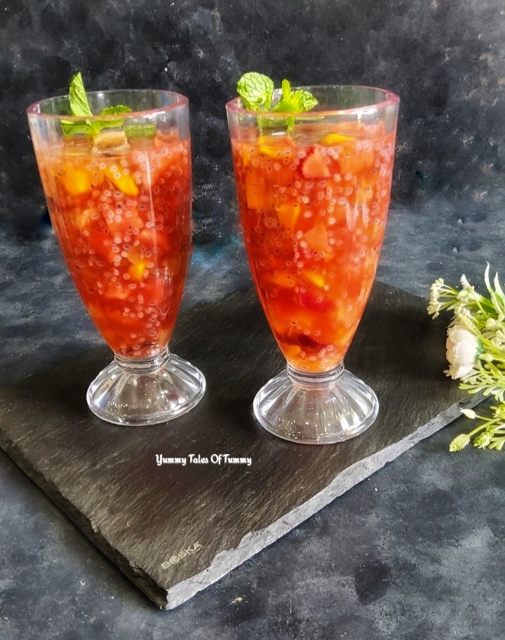 Using fresh chopped fruits, coconut water, lime juice, mint leaves, Rooh afza syrup  and Gond katira, the main ingredient of this recipe. It’s also known as Tragacanth Gum or Edible Gum and tukmaria / sweet basil seeds add perfect crunch.
