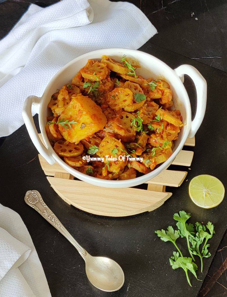 This sabzi is prepared using kamal kakdi and potatoes in delicious, spicy onion tomato based gravy.