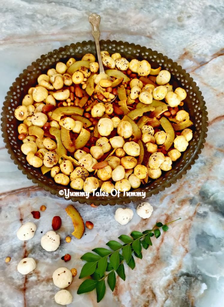 Makhana Chivda Recipe | Phool Makhana Chiwda is gluten free snack, made using makhana, peanuts, dry coconut, roasted bengal gram (dalia), almonds, curry leaves and some basic spices.