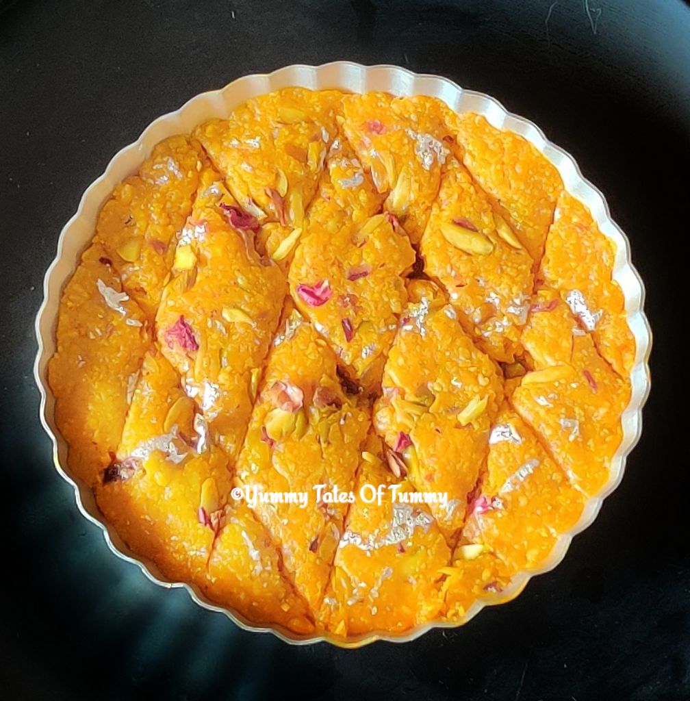 For clicking pics, I have changed the mold and set the mithai into pie tin.