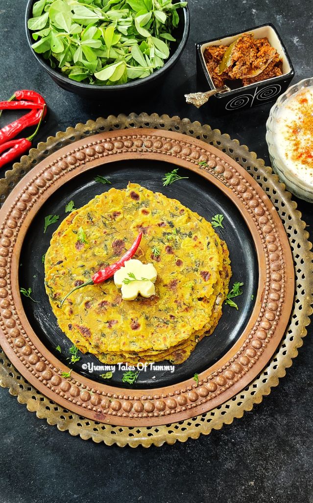 It is mainly made with wheat flour, fresh methi/ fenugreek leaves and a handful of Indian spices.