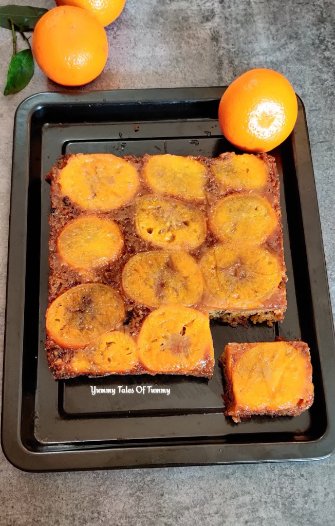This delicious Orange-Carrot upside down cake is perfectly moist and delightful, made with lots of fresh carrots and oranges.Flavoured with spices like Cinnamon, nutmeg, and ginger, each bite  of this cake is bursting with warm flavors.