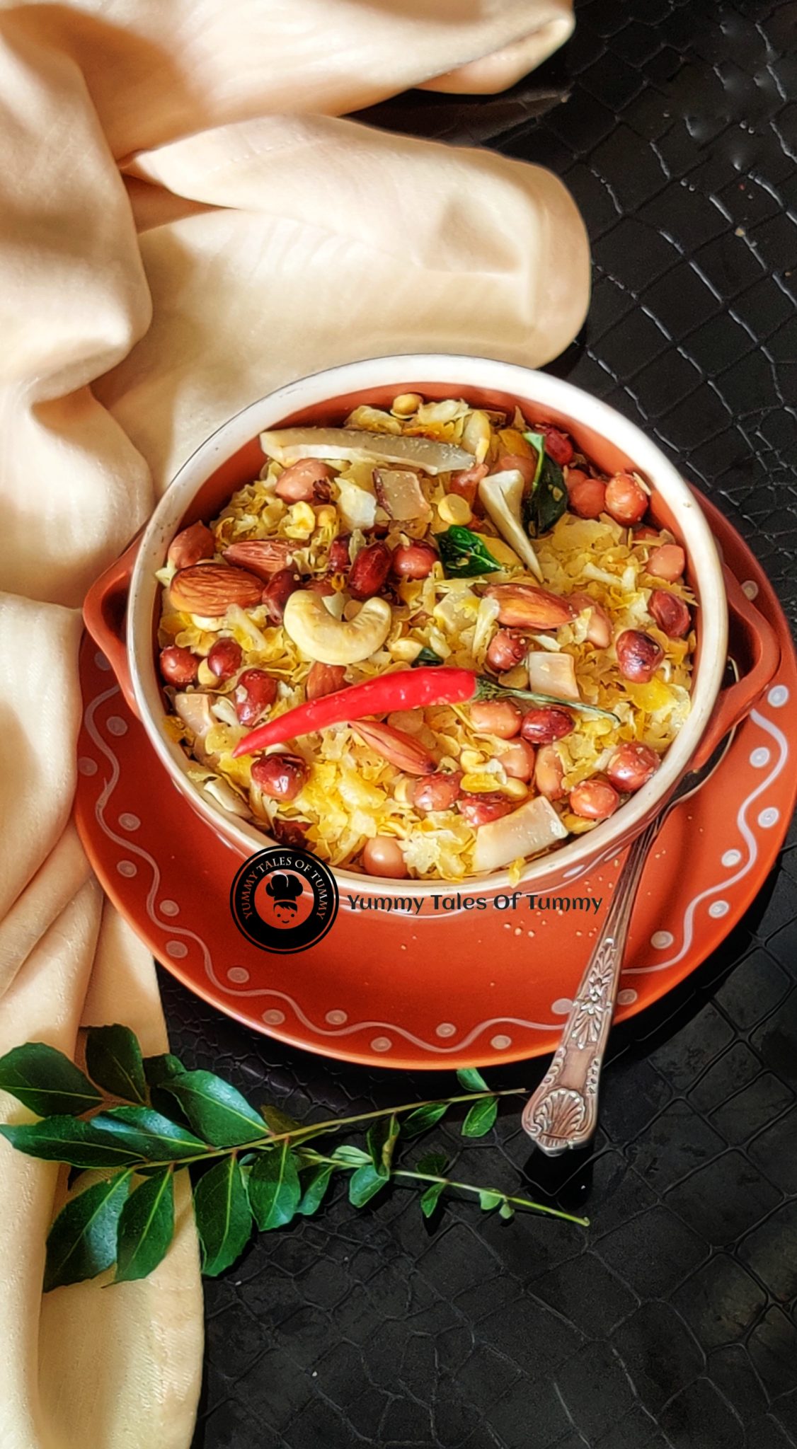 What I love the most about this recipe is it’s simplicity. It is mildly spicy, has a perfect sweetness, lovely crunch from thin poha & thinly sliced coconut, and nuttiness from dry nuts and peanuts.