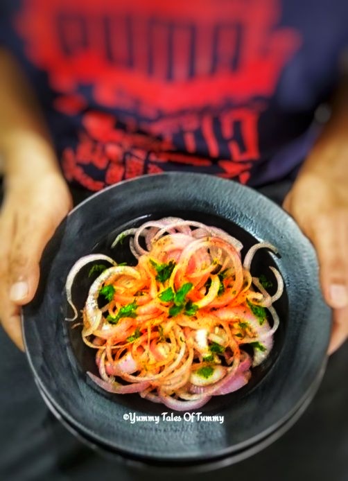 It is basically crunchy onion salad prepared  using onion rings tossed with chat masala, red chilli powder, lemon juice, fresh coriander leaves and salt.