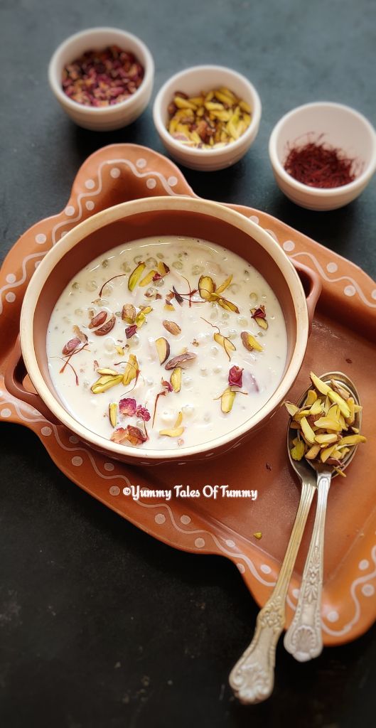 Sabudana kheer is an Indian style sweet pudding made with soaked  sabudana/sago, milk and sugar. It is a popular Indian sweet made on Hindu fasting days.