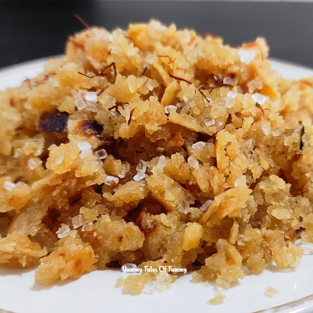 It’s made by mixing together freshly cooked chapatis/rotis/whole wheat flatbread that are crumbled with finger tips and mixed with lots of ghee and sugar.