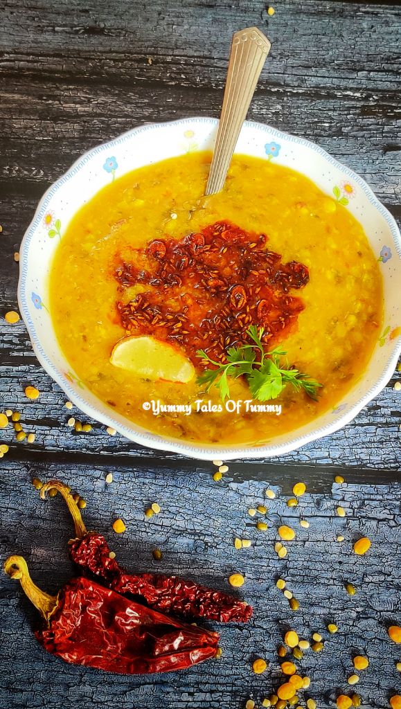Here ti/tri means three and dal means lentils. Tridali dal is combination of chana dal, hari moong dal and urad dal.