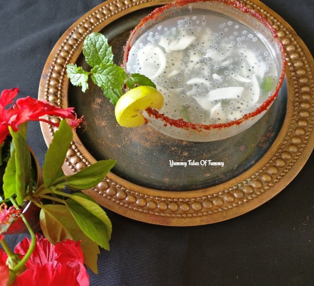 This cool beverage is prepared using tender coconut water, tender coconut meat(malai), soaked sabja/Takmaria seeds, lemon juice and mint leaves.