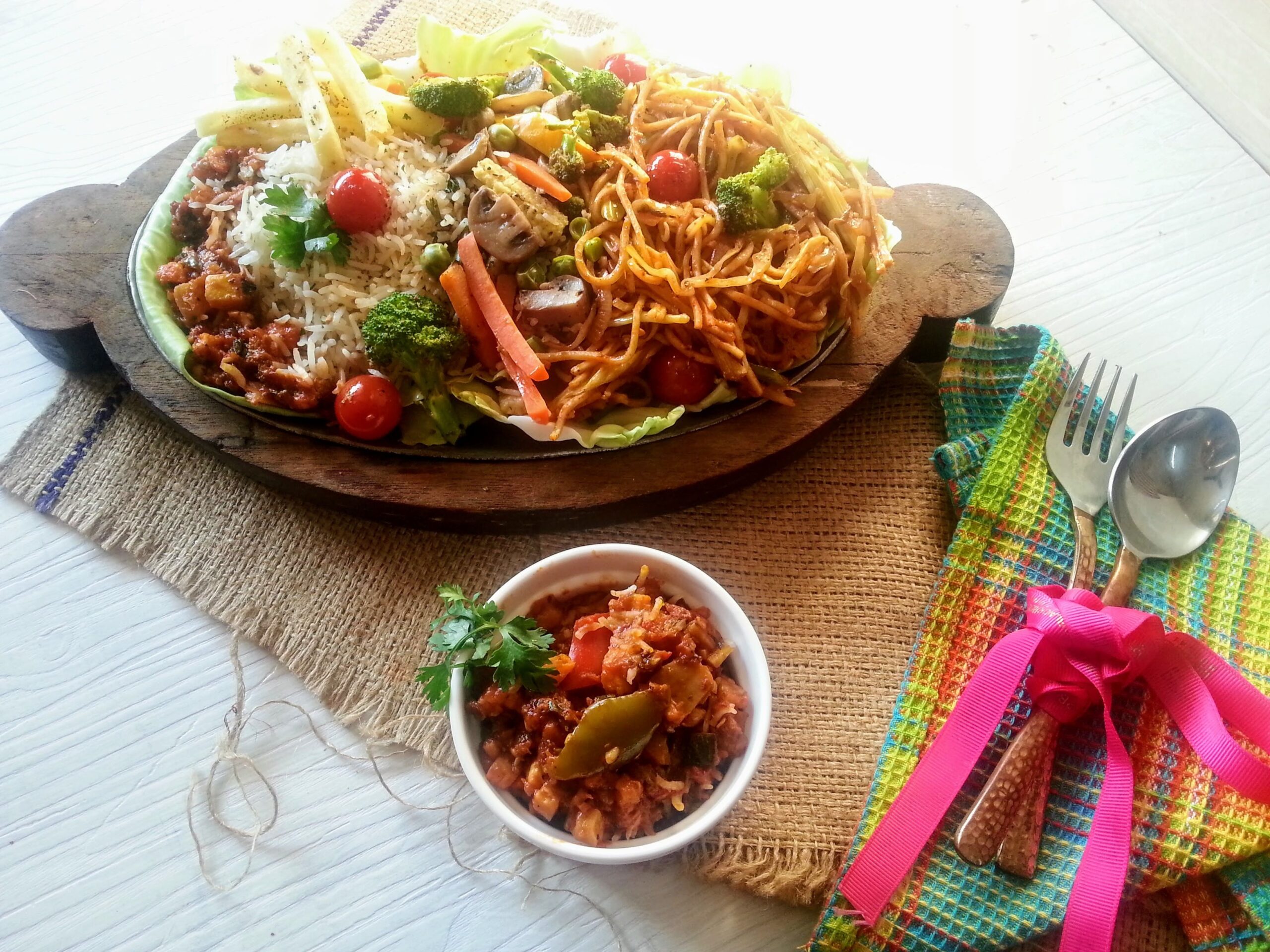 Arrange prepared rice, noodles, stir fried vegetables over cabbage leaves. Pour tex mex sauce over it. Add french fries on one side.