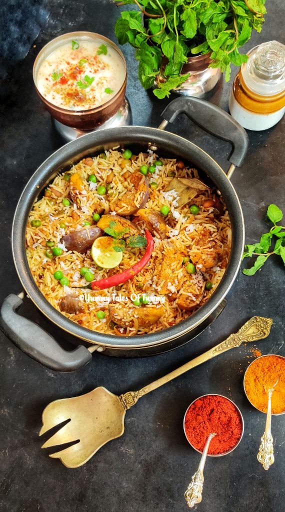 This rice prepration is made using green young brinjals and green peas. However you can use whatever variety of baingan/Brinjal/Eggplant/Aubergine is locally available in your area.