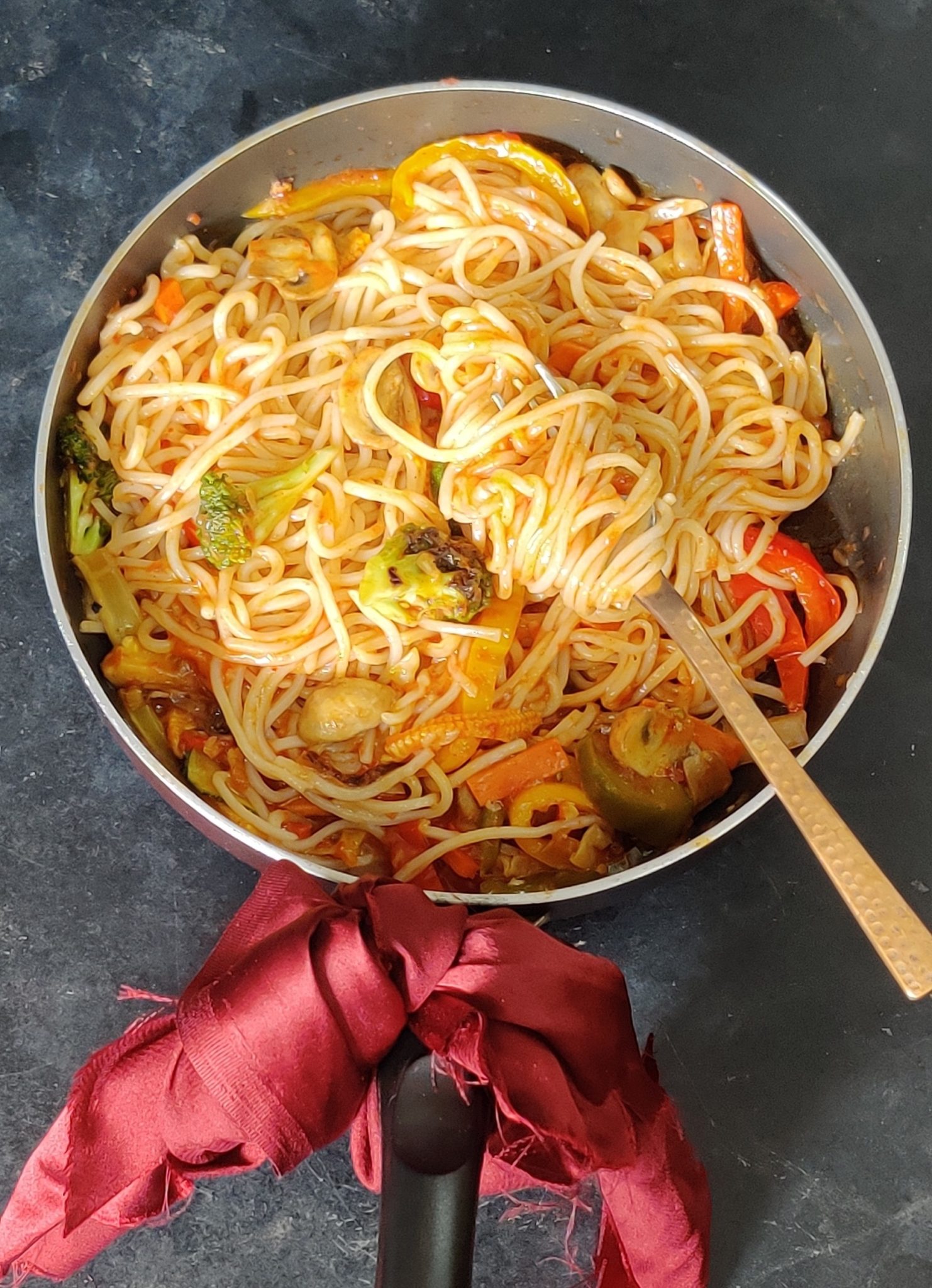 These hakka noodles are packed with flavors from the tomato and garlic, that is loaded with vegetables, making it refreshing. It’s a great change from regular meals like Dal, Rice,Sabzi and Raita.