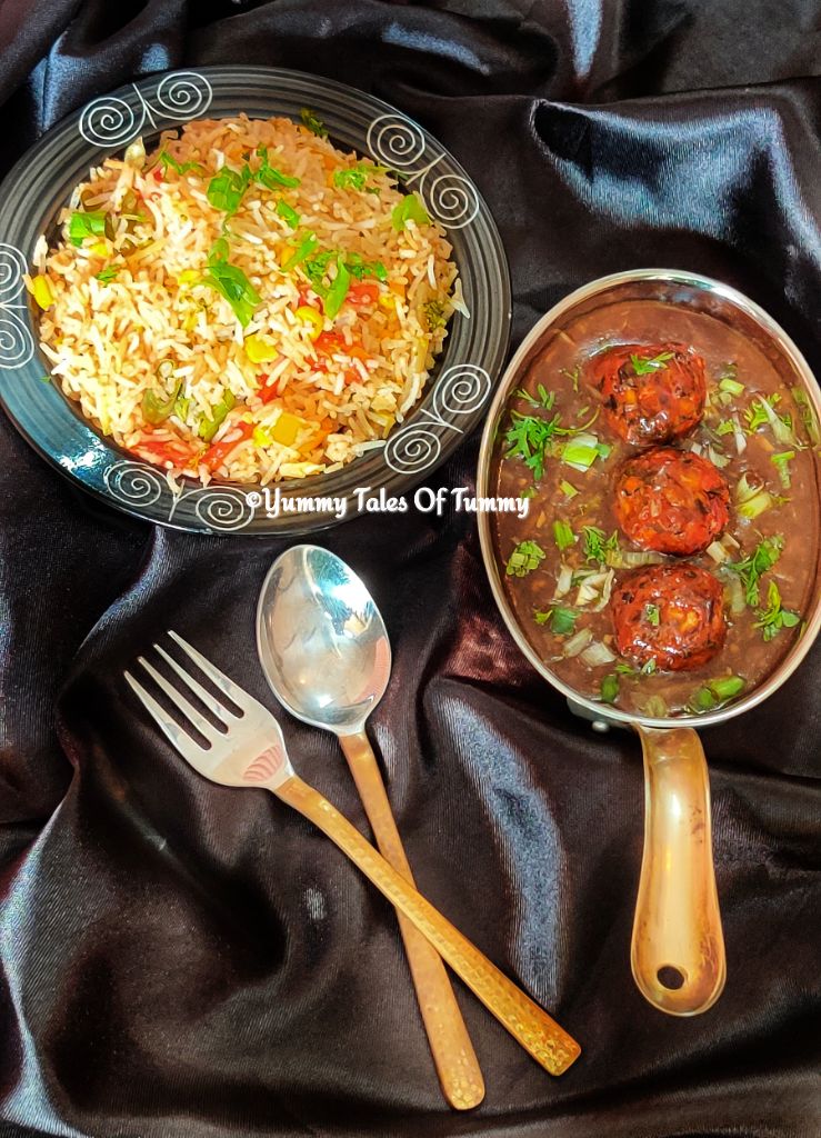 The perfect pairing for a Veg Manchurian gravy is, undoubtedly, Vegetable Fried Rice, I have shared earlier on the blog. Or you could serve it with veg hakka noodles.